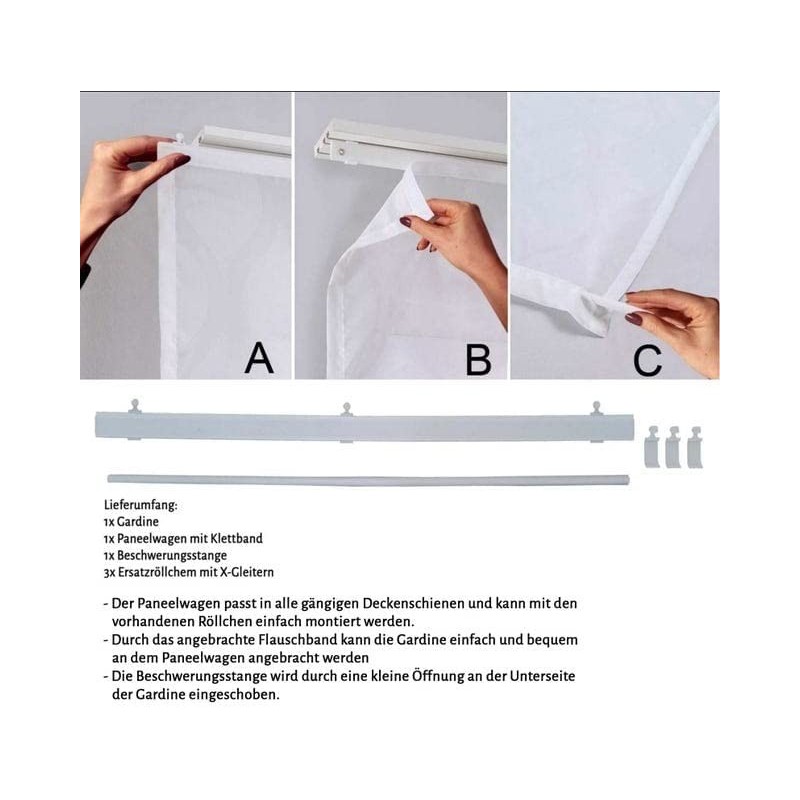 Lieferumfang: Schiebegardine mit  Flauschband, Laufwagen und Beschwerungsstange.