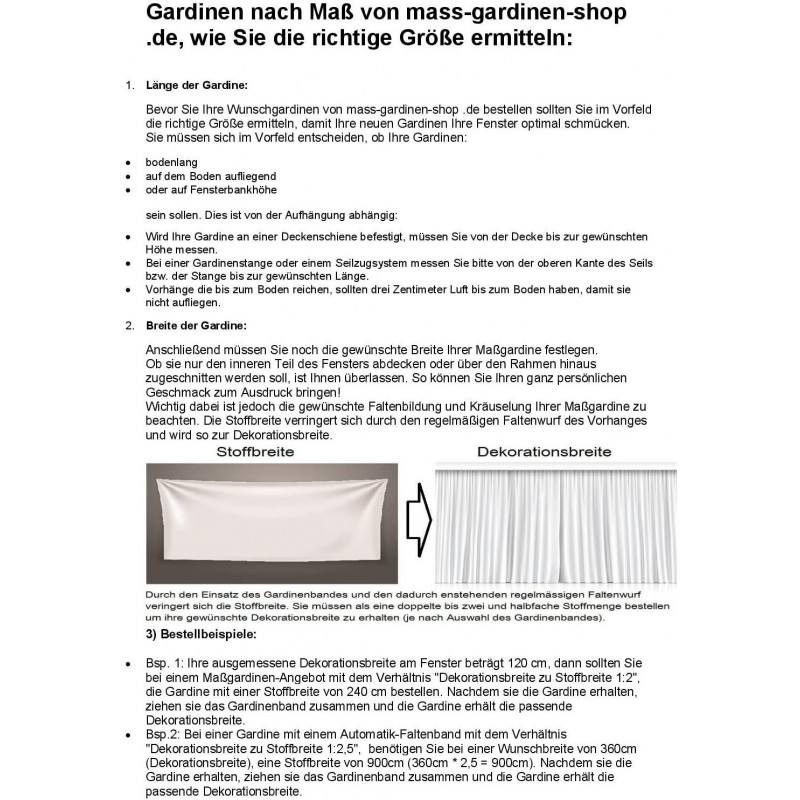 Genaue Angaben darüber, wie Sie die Größe Ihrer Gardine richtig ausmessen, finden Sie in der Kategorie "Gardinen richtig ausmessen" auf unserer Homepage.