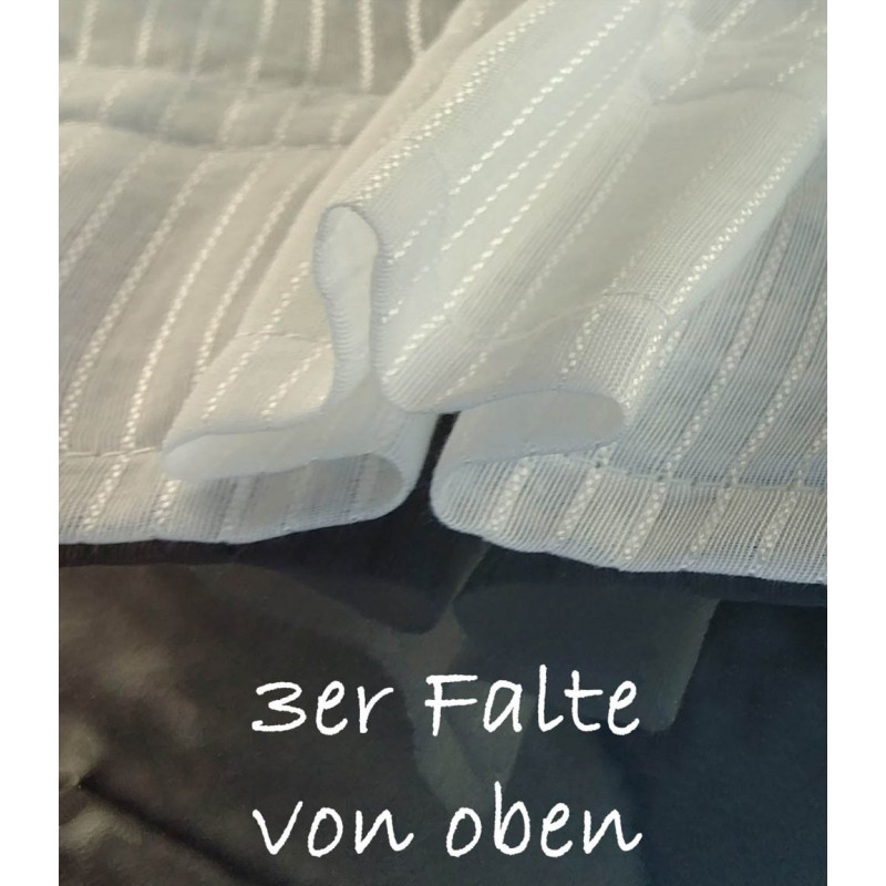 Mithilfe des eingenähten Automatik-Faltenbandes (Verhältnis 1:2,5) können Sie Ihre maßgefertigte Fensterdekoration kinderleicht professionell dekorieren. Ziehen Sie die Gardine einfach auf die gewünschte Breite zusammen. Dadurch entsteht alle 10cm eine wunderschön fallende Falte. Die Stoffbreite reduziert sich um ca. 60% durch den regelmäßigen Faltenwurf des Vorhanges. Das Verhältnis von Dekorationsbreite zu Stoffbreite beträgt ca. 1:2,5 mit einer 3er-Falte.